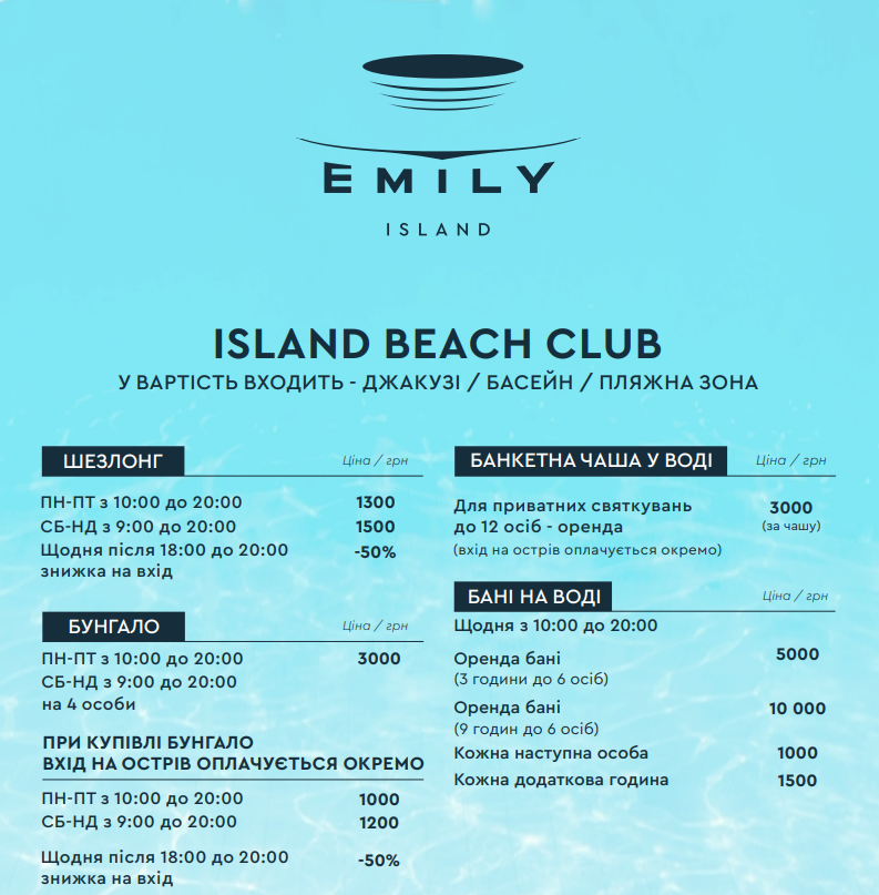 В будние дни с понедельника по четверг стоимость отдыха стартует от 450 гривен за место в зеленой зоне. Если хочется больше комфорта – стандартный шезлонг стоит 550 гривен, комфортный – 650, а для двоих можно взять шезлонг-ракушку за 1200 гривен. Самый уютный вариант – бунгало на двоих, его цена – 2000 гривен. Для детей от 3 до 14 лет вход обойдется в 350 гривен.