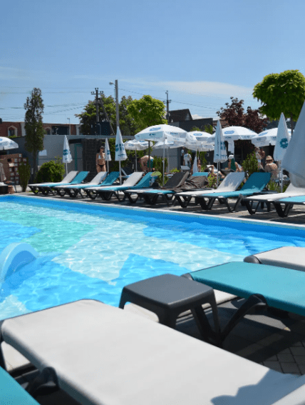 Этот бассейн находится недалеко от центра Львова, на улице Горбачевского, 24. Работает с 9:00 до 21:00. Стоимость дневного входа – 600 гривен для взрослых и 400 гривен для детей. На территории отеля есть ресторан, бар с мороженым и напитками.