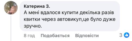 - "Имею больше 30 поездок за последний год — ни разу "Укрзализныця" — Ukrzaliznytsia не подвела с билетами. Всегда покупали куда надо и какие нужно билеты именно через приложение, заранее ввожу пассажиров, планирую поездки и пользуюсь автовыкупом. И имею немного терпения, билеты сдают резервы. На прошлой неделе поздно вечером пятницы выкупился билет на утреннем субботнем интерсите Харьков — Киев, что вполне супер.