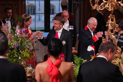 На мероприятии первая леди Франции сидела между принцем Уильямом и королевой-консорт Камиллой, а вот Франсуа Макрон – с другой стороны, между Кейт Миддлтон и королем Чарльзом III. При этом фотографы зафиксировали, как Макрон подмигивает Миддлтон после того, как они чокнулись бокалами, пишет издание Peroz.ro.