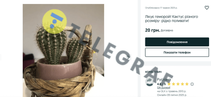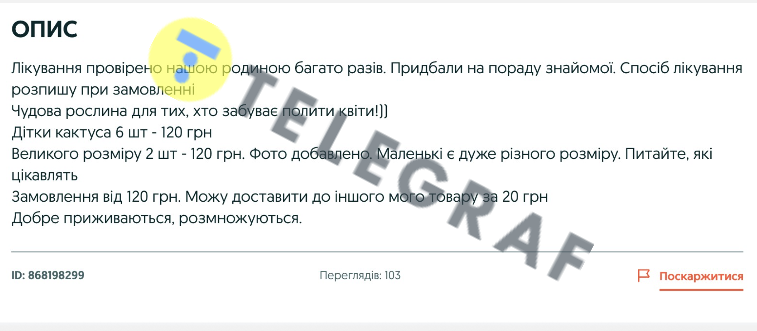 "Лечит геморрой кактус разного размера. Лечение проверено нашей семьей много раз. Приобрели по совету знакомой. Способ лечения распишу при заказе", — говорится в объявлении.