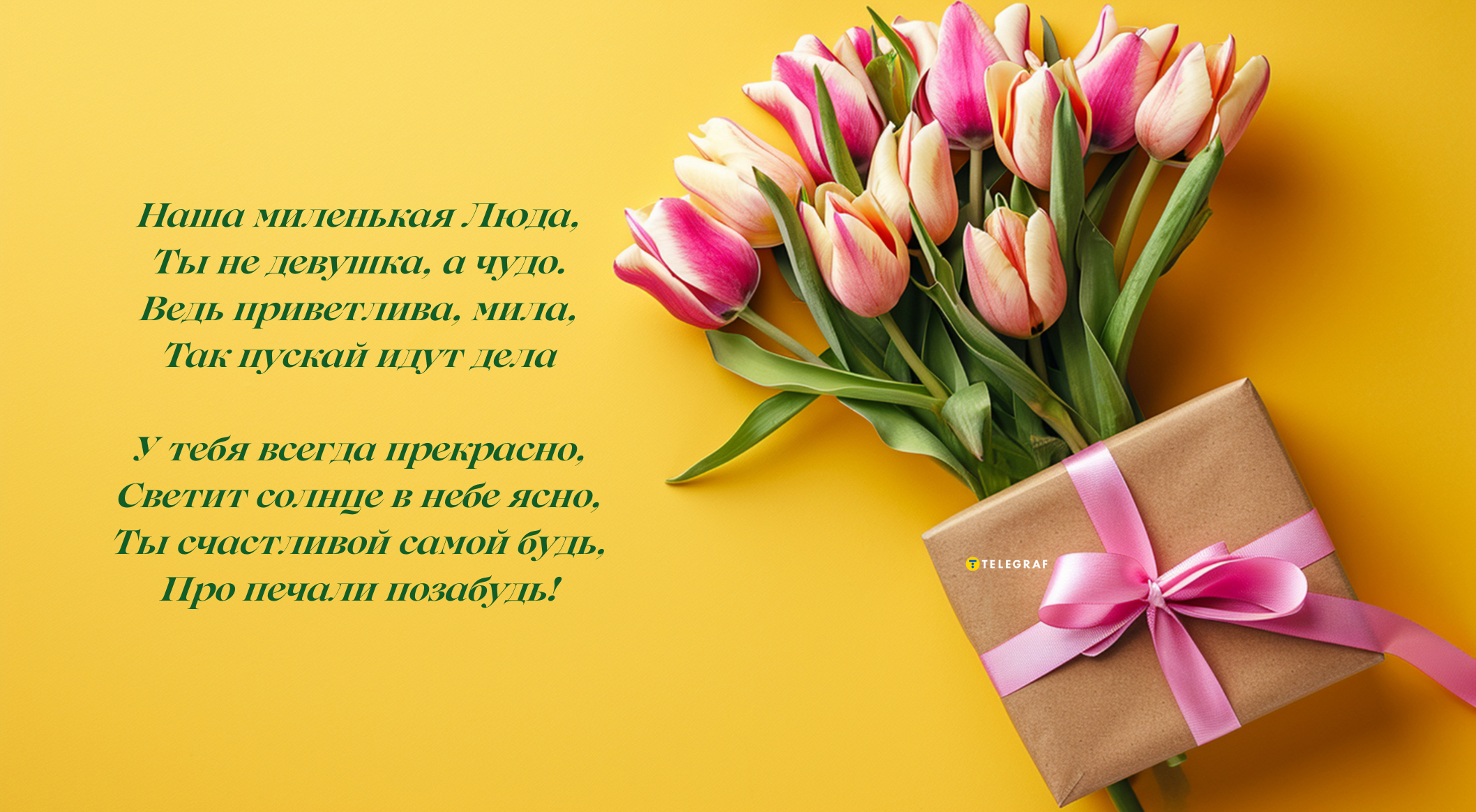 Людмила, с днем рождения! 🎂🌷 Пусть каждый день начинается с улыбки, а заканчивается радостью. Пусть рядом будут только близкие по духу люди, в душе будет мир и гармония, а в сердце — любовь. Будь счастлива, Люда! 💐✨