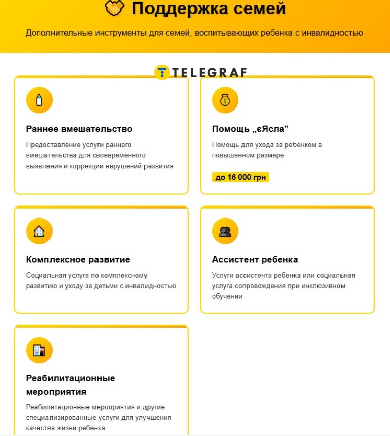 Родители детей с инвалидностью будут иметь право на повышенную помощь "єЯслі" — сумма будет составлять до 16 тысяч гривен ежемесячно. Также будут предоставляться услуги раннего вмешательства, комплексного развития и сопровождения во время инклюзивного обучения.