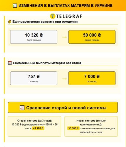 По данным Минсоцполитики, единовременная выплата женщинам после рождения ребенка вырастет с 10 320 гривен до 50 тысяч гривен. Это почти пятикратное увеличение пособия. Ее получают все матери вне зависимости от трудового стажа. Раньше женщины получали 10320 грн сразу, и 860 грн ежемесячно до достижения ребенком 3-летнего возраста (итого 41280 грн), его ввели в 2014 году и с тех пор не меняли.