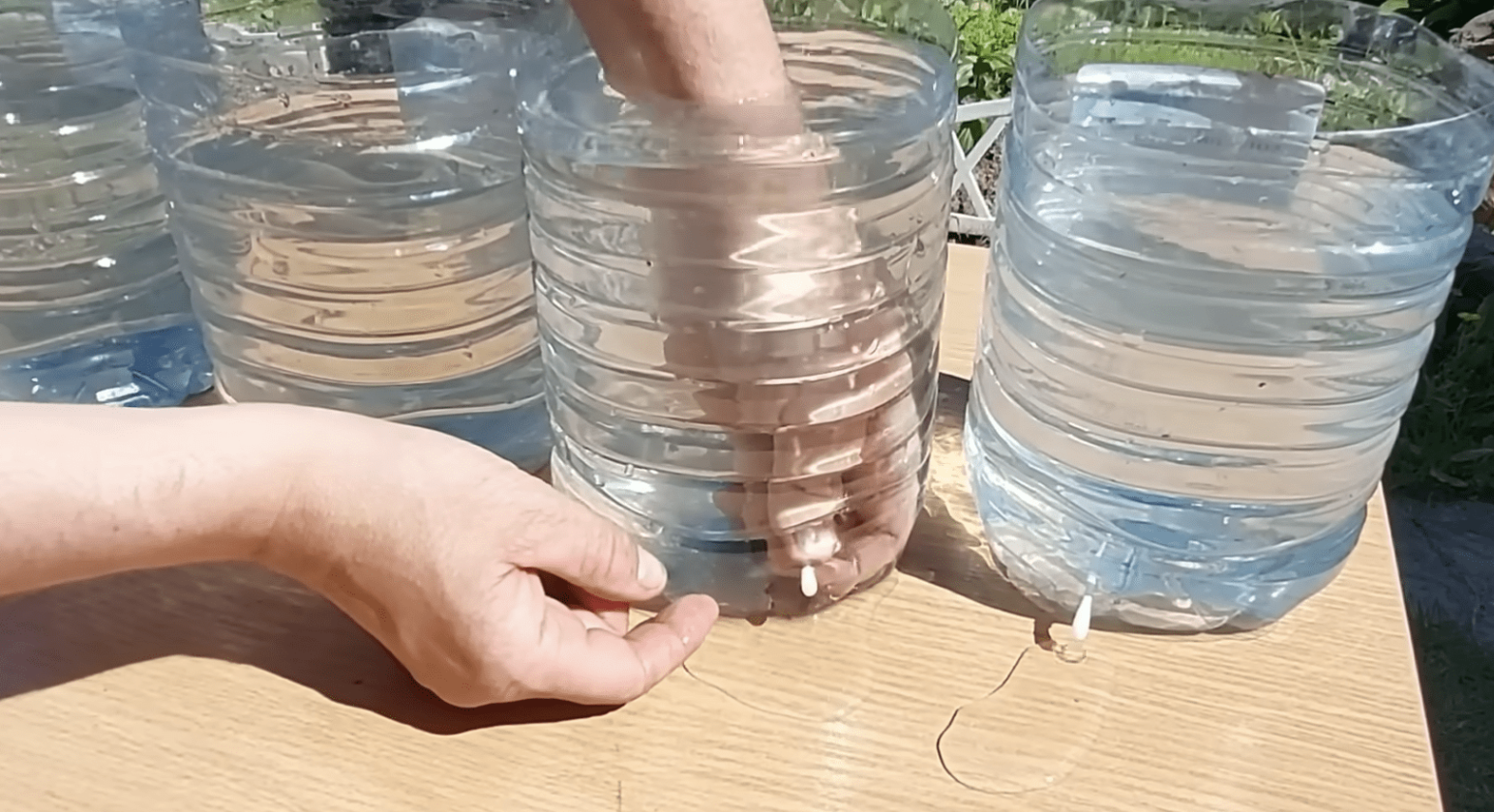 Для этого подойдут бутылки из-под воды или напитков, желательно использовать баклажки. Такие емкости содержат больше воды и их нужно будет наполнять не так часто, как маленькие.