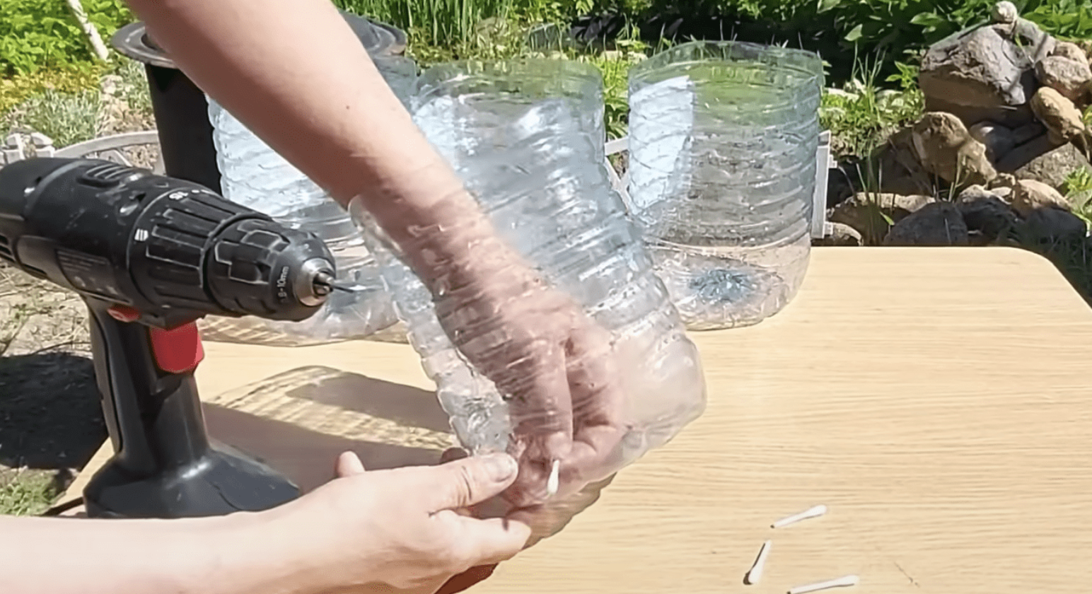 Чтобы сделать капельный полив своими руками, нужно сделать гвоздями маленькие отверстия на дне бутылки сбоку. В полученные дыры вставить ушные палочки, предварительно разрезанные пополам. Чтобы облегчить прокол бутылки, гвоздь можно нагреть.