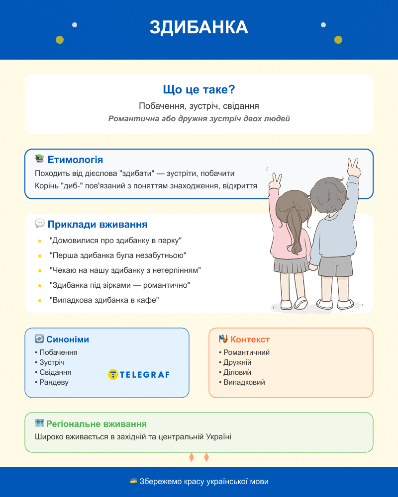 "Здибанка" — это не что иное, как свидание или встреча. В разговорном стиле слово здибанка используется для обозначения неформальной встречи — обычно с кем-то, кто дорог или интересен, например, с другом, подругой или любимым человеком. Оно имеет теплый, непринужденный оттенок и часто используется в молодежном или бытовом контексте.