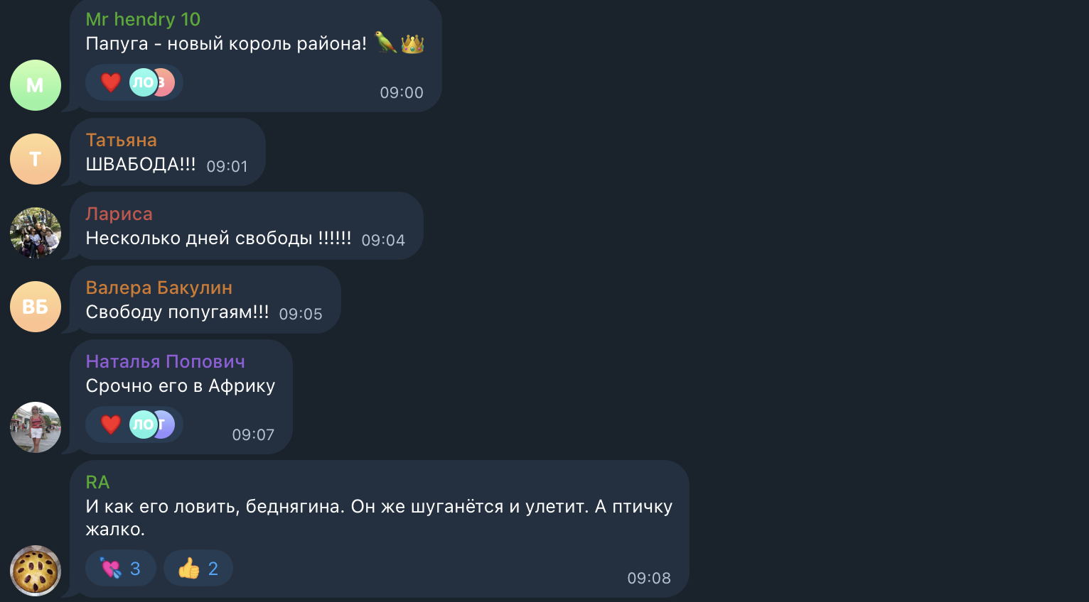 В комментариях нашлись его владельцы и подтвердили, что птица вылетела в окно на кухне, а женщина не успела его поймать. Попугая зовут Красавчиком. Небезразличные предложили свою помощь.