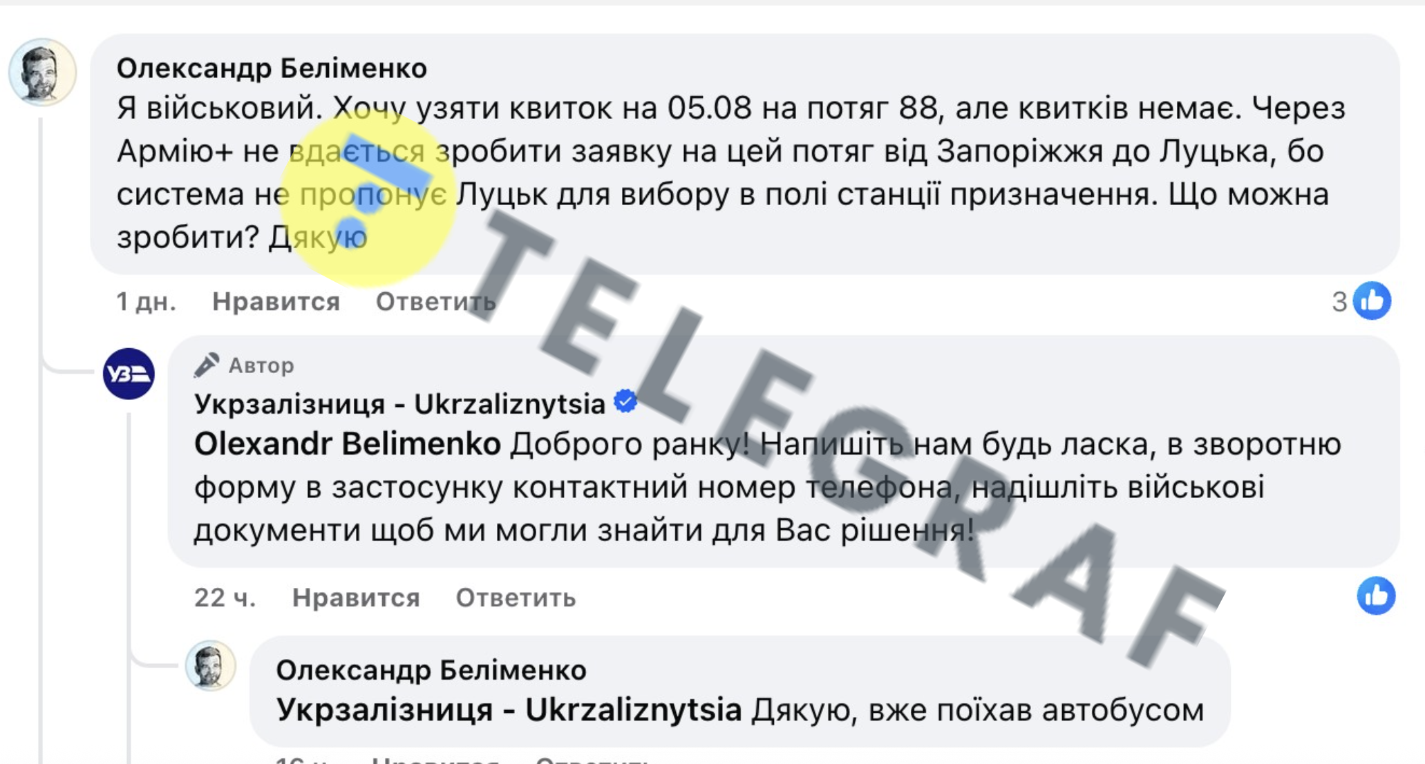 Об этом мужчина написал в комментариях под одним из постов УЗ. По его словам, не было нужных билетов на сайте "Укрзализныци" и из-за применения Армия+ не удалось их приобрести.