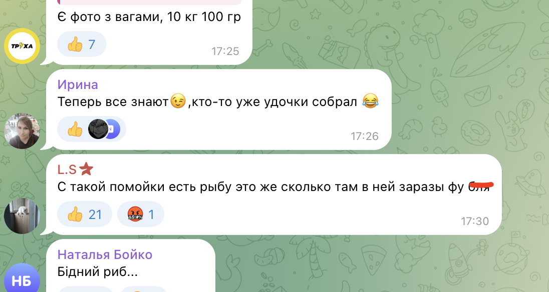 В комментариях многие пользователи были удивлены таким уловом, особенно на Монастырском острове в Днепре, где рыба обычно клюет плохо. Кто-то подчеркнул, что столь крупную рыбу следует выпускать. Были и комментарии о том, что рыбу из Днепра нельзя есть, ведь вода в реке достаточно грязная.