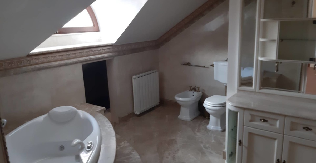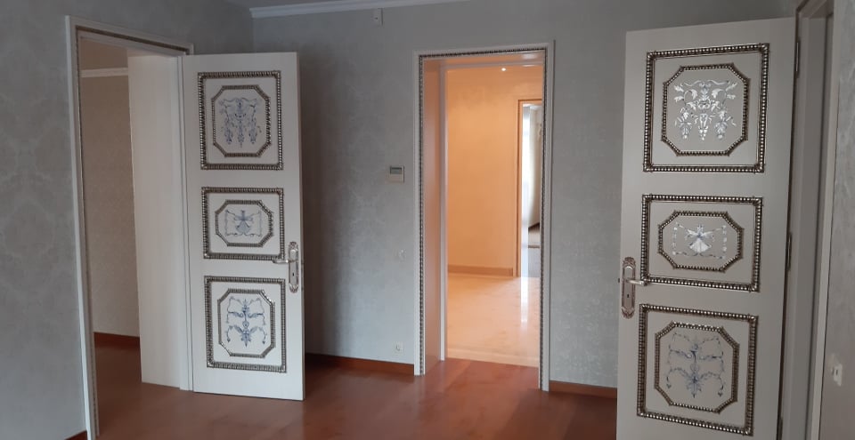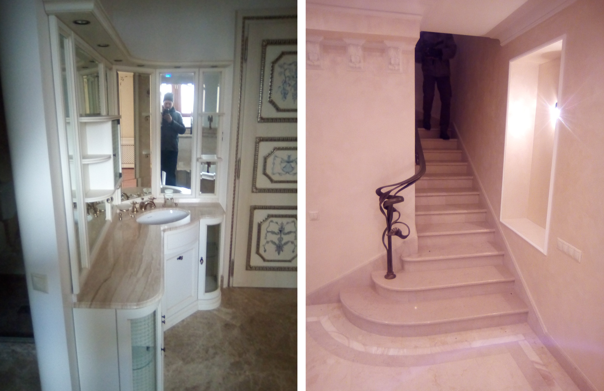 Так, в этой квартире сделаны полы из элитного итальянского мрамора, на стенах есть красивая лепнина, двери и элементы мебели и декора — из дорогих пород дерева. Также в квартире есть свой камин, автономное отопление и роскошная сантехника с позолотой и даже джакузи в одном из санузлов.
