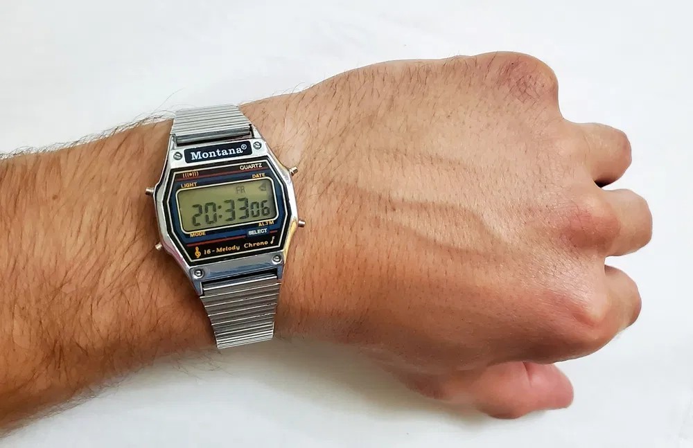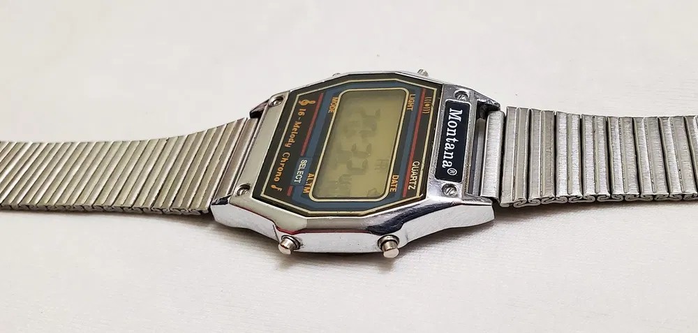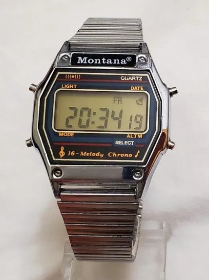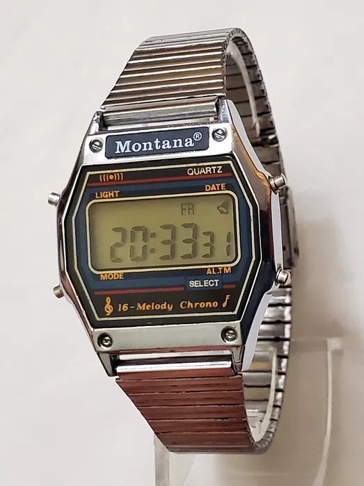 В публикации говорится, что часы "Montana-USA" имеют хромированный корпус и кварцевый механизм. На фото видно, что часы электронные.