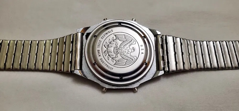 По словам продавца, аксессуар изготовлен в США в 80-х годах, но продолжает работать и сегодня. В комплекте имеется браслет из нержавеющей стали шириной 18 мм.