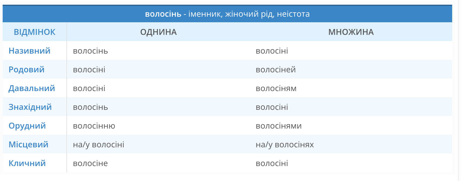 Заметим, что "волосінь" — рыболовное снаряжение, длинная крепкая нить, привязанная к удилищу, на конце которой прикреплен рыболовный крючок. Это существительное женского рода, имеющее форму множественного и единственного числа, склоняется. Интересно, что даже будто бы при двойном звучании "нн" в конце слова на украинском, две буквы есть только в варианте "волосінню".