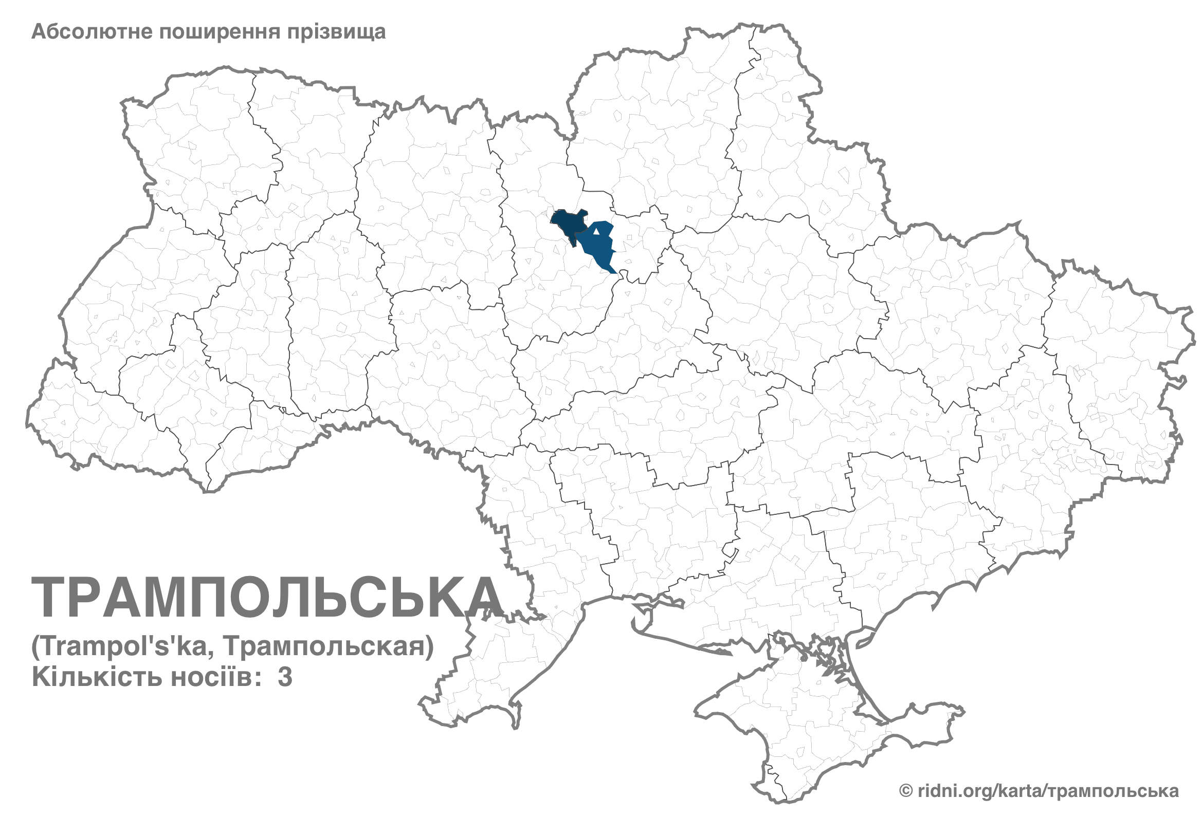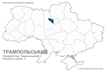 Фамилии Трампольская и Трампольский имеют по 3 носителя каждая. Эти семьи живут в центральной части страны, что свидетельствует о возможном совместном происхождении этих вариантов.