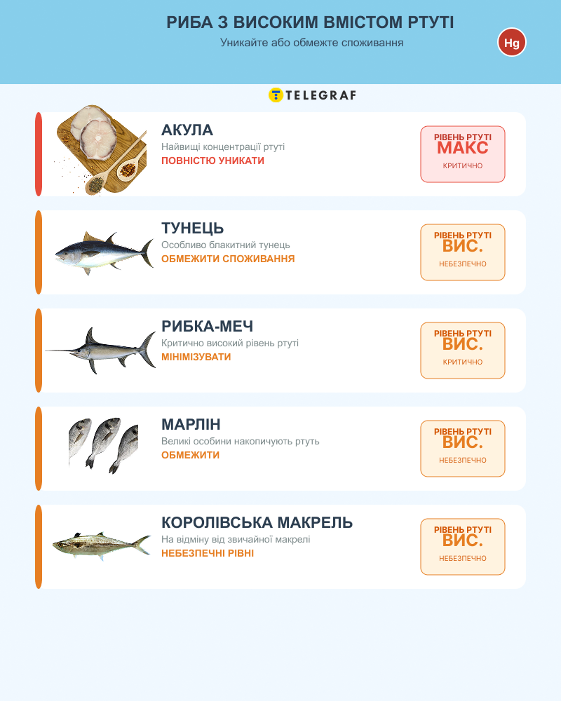 Морской окунь, часто появляющийся на прилавках украинских магазинов, накапливает ртуть из-за своего длительного жизненного цикла. Эту рыбу можно включать в рацион, но не чаще двух раз в неделю и в небольших порциях.