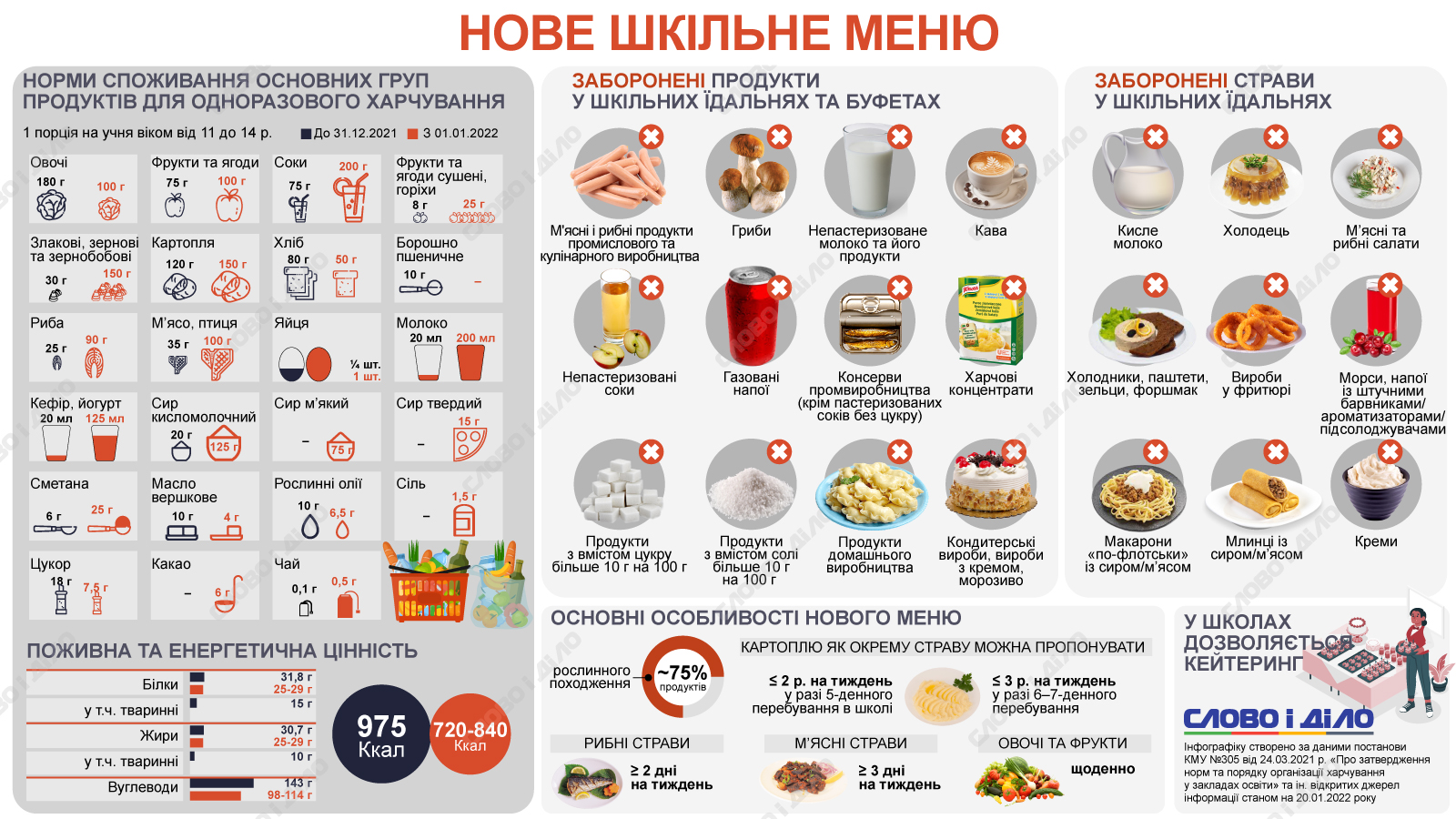 Сегодня принципы организации школьного питания кардинально изменились. Современные программы питания в школах Украины базируются на рекомендациях Всемирной организации здравоохранения и включают в себя свежие овощи и фрукты ежедневно, нежирные сорта мяса и рыбы, цельнозерновые продукты, молочные продукты с низким содержанием жира при ограничении соли, сахара и трансжиров.
