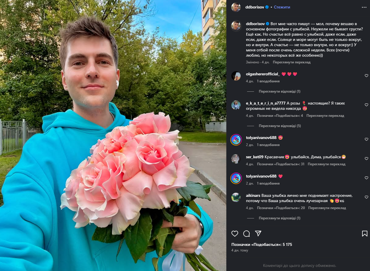 Ведущий продолжает зарабатывать кровавые рубли, развлекая россиян по телевидению и на онлайн-платформах. Он берет интервью в ярых пропагандистов, российских артистов и спортсменов, которые поддерживают кровопролитную войну против украинцев. При этом Борисов не комментирует военные события и умалчивает о преступлениях путинской армии.