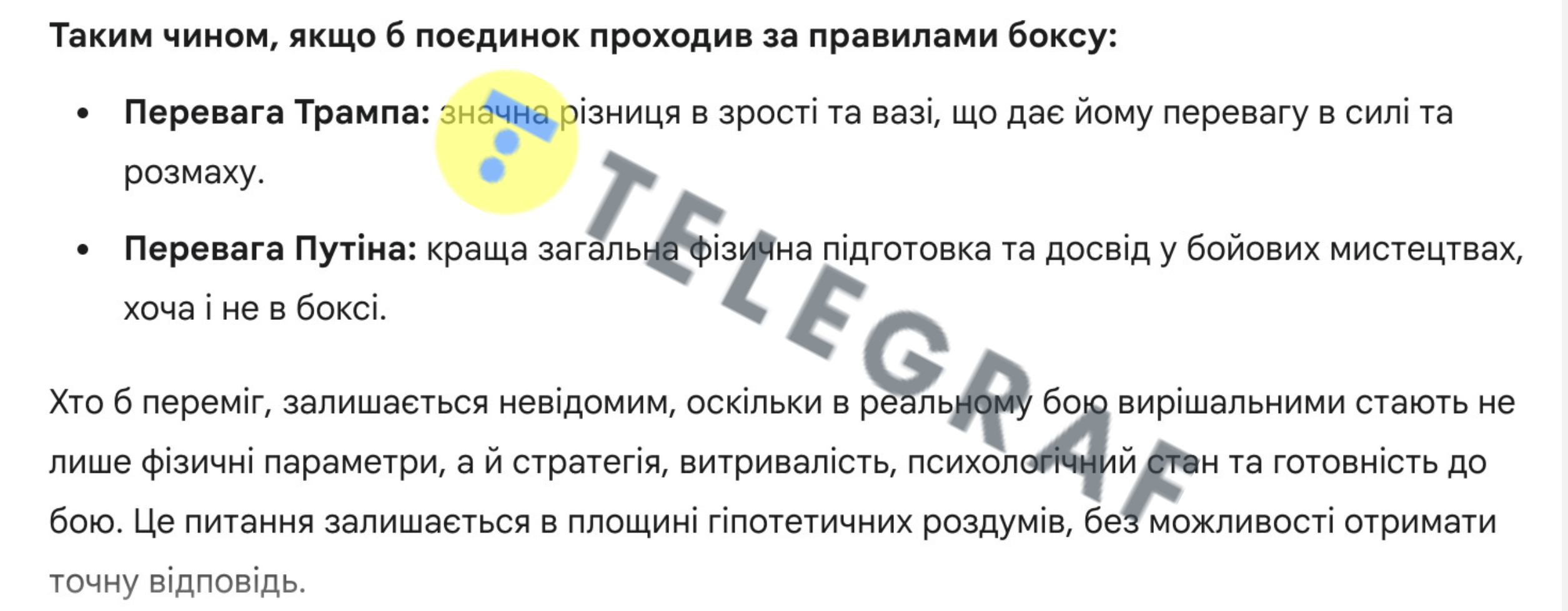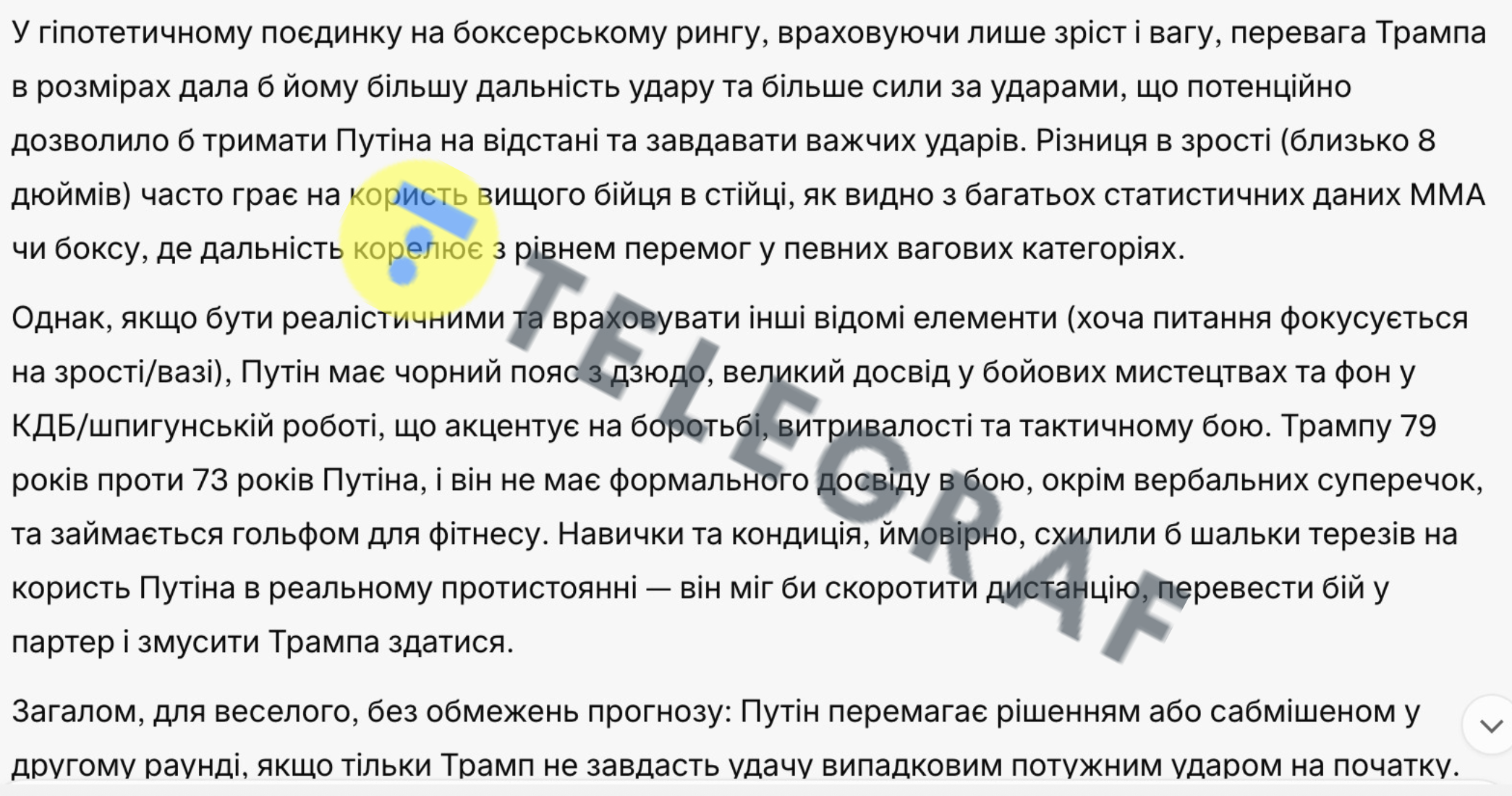 "Телеграф" спросил три ИИ, и каждый из них фактически был единогласным в своем вердикте. Учитывая боевой опыт, спортивное прошлое, вес и возраст, искусственный интеллект говорит, что вероятнее всего в поединке победил бы Путин. Ведь Трамп, хоть и больше своего противника, не имеет того опыта, как глава Кремля.
