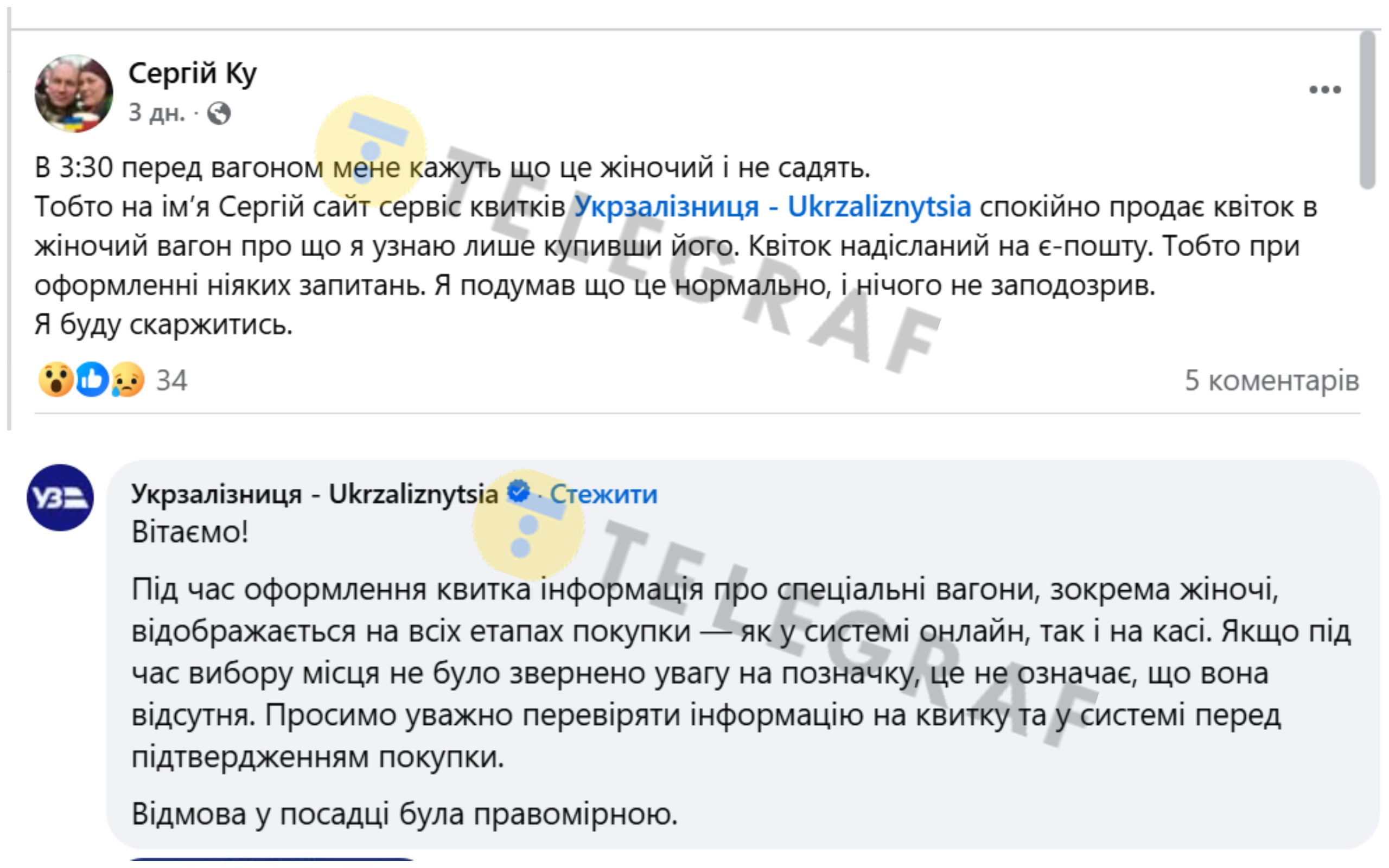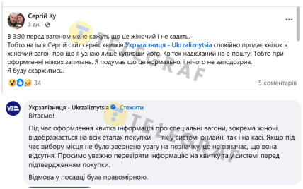Военный Сергей Ку в Facebook рассказал, что он приобрел билет, но в 3:30 в его поезд его не посадили. Причина в том, что мужчина купил билет в женский вагон.