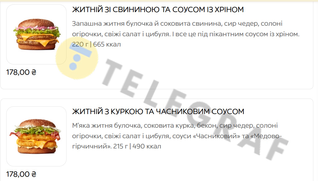 На сайте ресторана не указана стоимость блюд. Они могут отличаться в зависимости от города и конкретного заведения. В комментариях представитель МакДональдз сообщил, что цена на украинские бургеры 155 гривен. На сайте доставки glovo указаны цены: ржаной со свининой и соусом с хреном – 178 гривен, с курицей и чесночным соусом – аналогичная цена, 178 гривен.