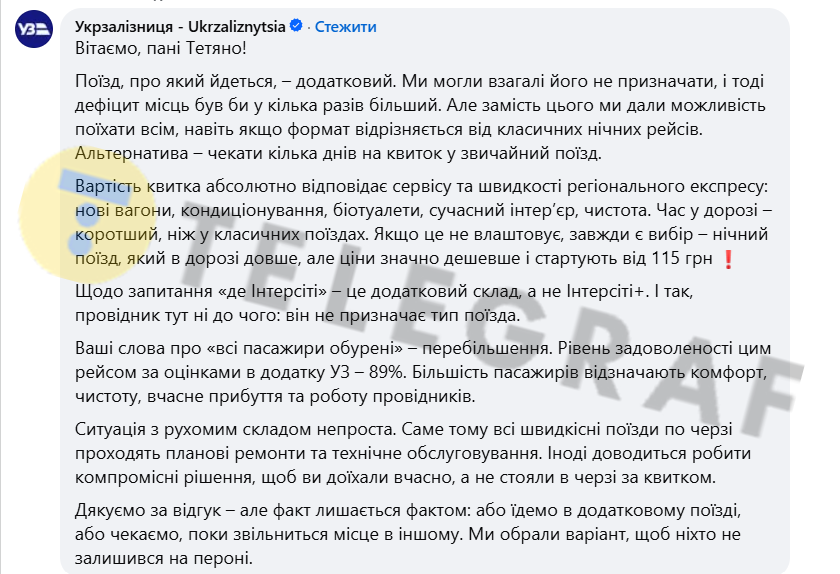 Представитель перевозчика добавил, что слова украинки, что "все пассажиры возмущены" – преувеличение. Уровень удовлетворенности этим рейсом по оценкам в приложении УЗ – 89%. Большинство пассажиров отмечают комфорт, чистоту, своевременное прибытие и работу проводников.
