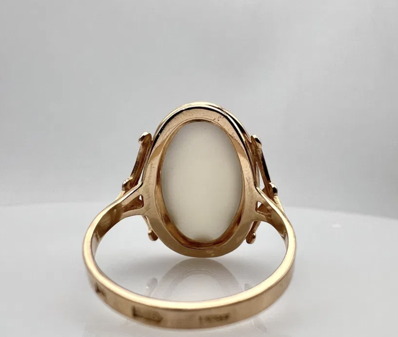 Продавец отмечает, что это раритетное украшение со времен СССР. Кольцо золотое, имеет пробу 583 и вставку из камня халцедон. Его размер 21,7х15 мм. Общий вес кольца 6,45 г и размер 19. Стоимость кольца 21 300 грн.