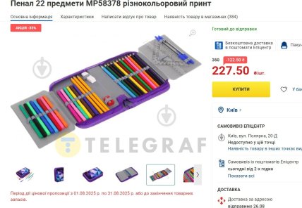Итак, самый дешевый пенал со всеми базовыми канцтоварами стоит, например в Эпицентре, 227,50 гривны.