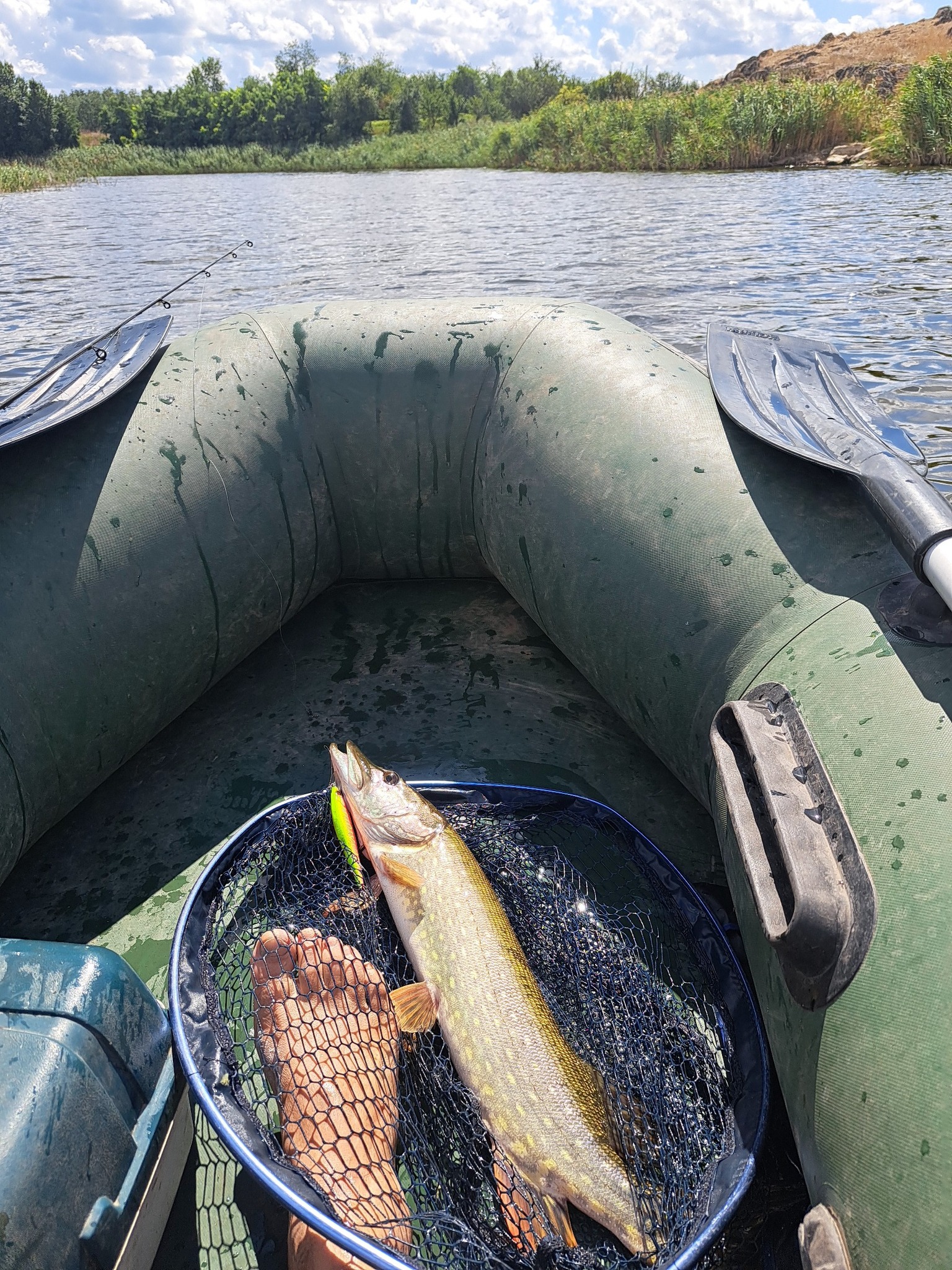 В праздник мне фартонуло как рыбаку. Это моя самая любимая рыба. Она просто не дается. Нужна активная ловля. И когда щука ударяет она не сдается и устраивает борьбу за свою свободу и даже может быть немного хитрее — как эта. Взяла далеко от лодки и шла спокойно — а ближе со сбереженными силами устроила сопротивление со скачками в высоту и балетом на поверхности воды. Потом нырнула под лодку и хорошо, что сработала катушка, потому что одной рукой не мог удержать спиннинг, а вторая с беспомощной подхваткой была без действия