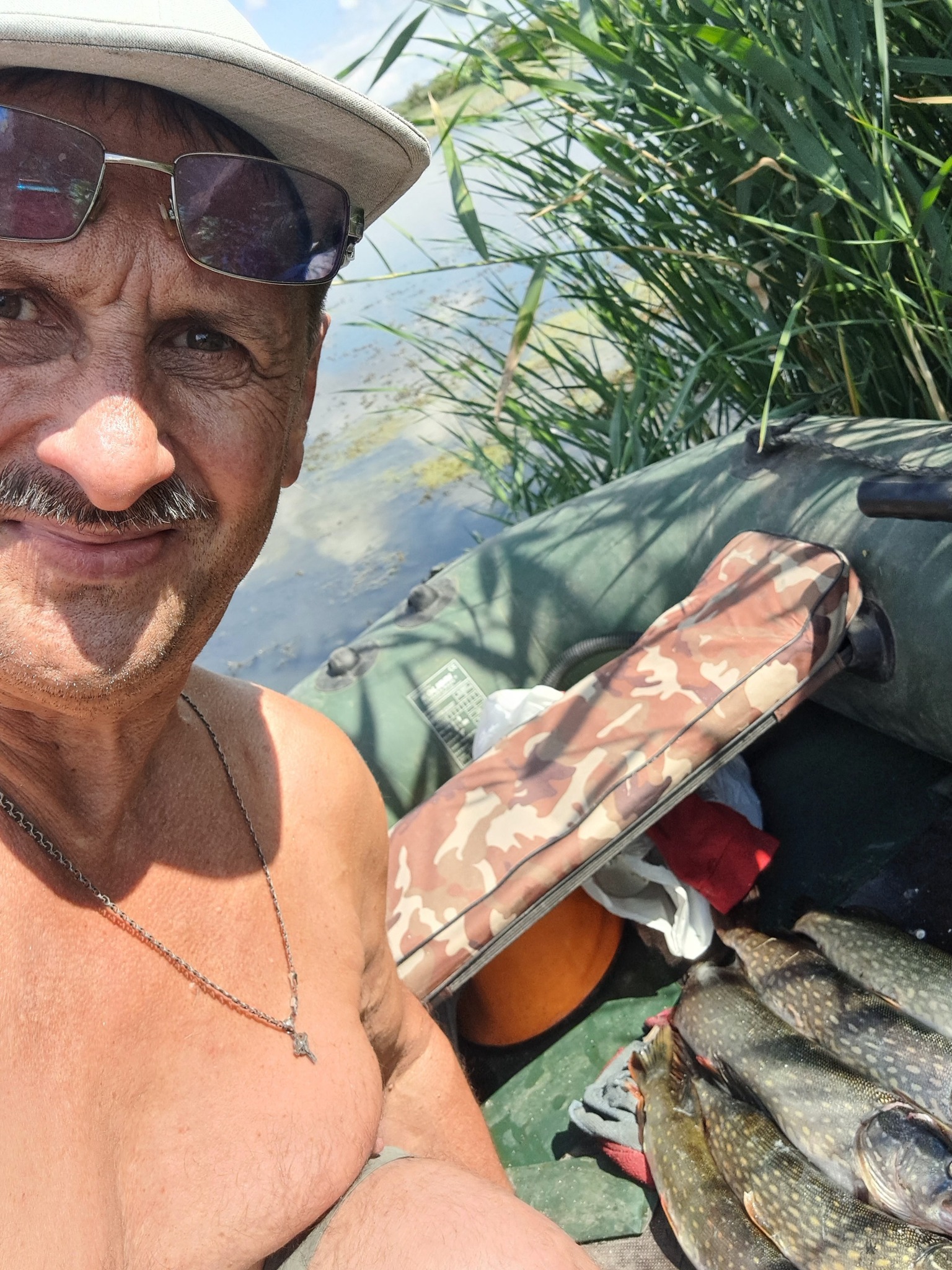 Рыбалка в Украине является распространенным увлечением. Рыбаки, как водится, хвастаются уловом — мужчина показал щук, которых ему удалось поймать в праздник — День Независимости.