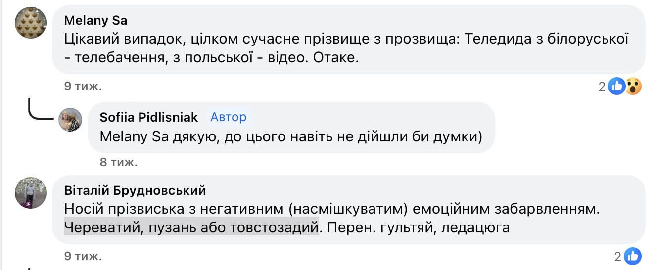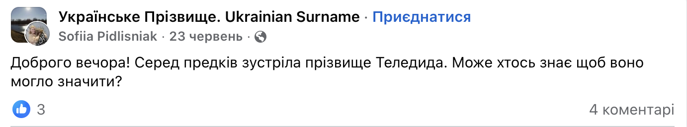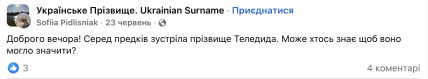 О происхождении необычной фамилии спросили у Facebook-сообщества "Украинская фамилия". Автор сообщения интересуется, что означает фамилию Теледида.
