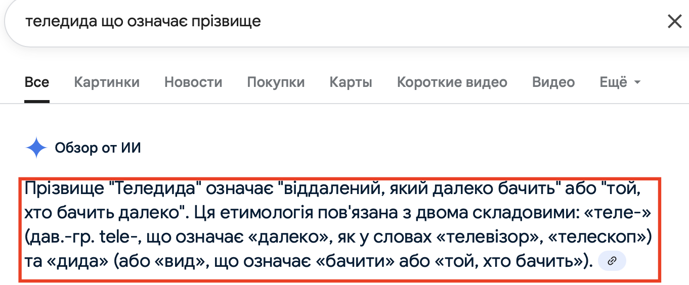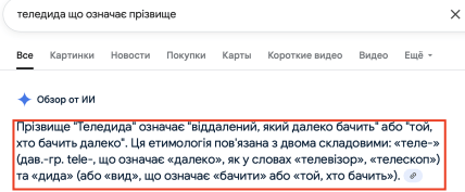 А вот искусственный интеллект Gemini приводит альтернативное объяснение, что фамилия Теледида может означать "удаленный, который далеко видит" или "видящий далеко".