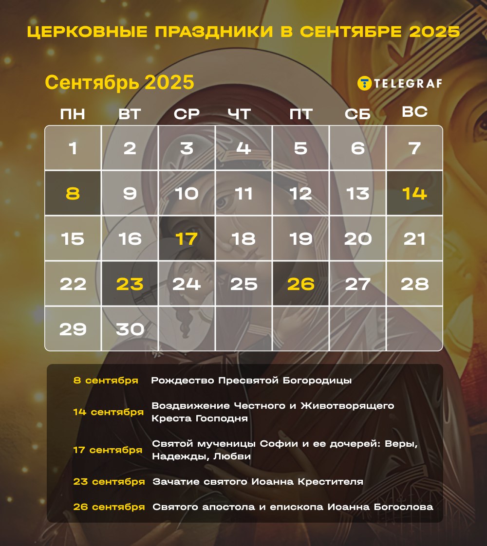"Телеграф" подготовил церковный календарь праздников на сентябрь 2025 года, чтобы вы не пропустили важные даты.