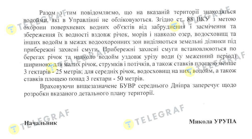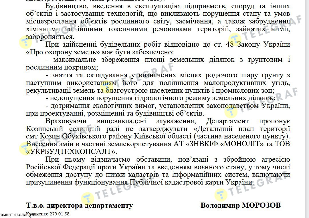 Самым категоричным был Департамент экологии и природных ресурсов Киевской областной военной администрации, который в своем заключении, в частности, упомянул о запрете любого строительства в поймах рек (а указанный участок расположен как раз в такой пойме) и рекомендовал не утверждать ДПТ, разработанный в интересах Инвестфонда "Монолит" Антона Дрепина.