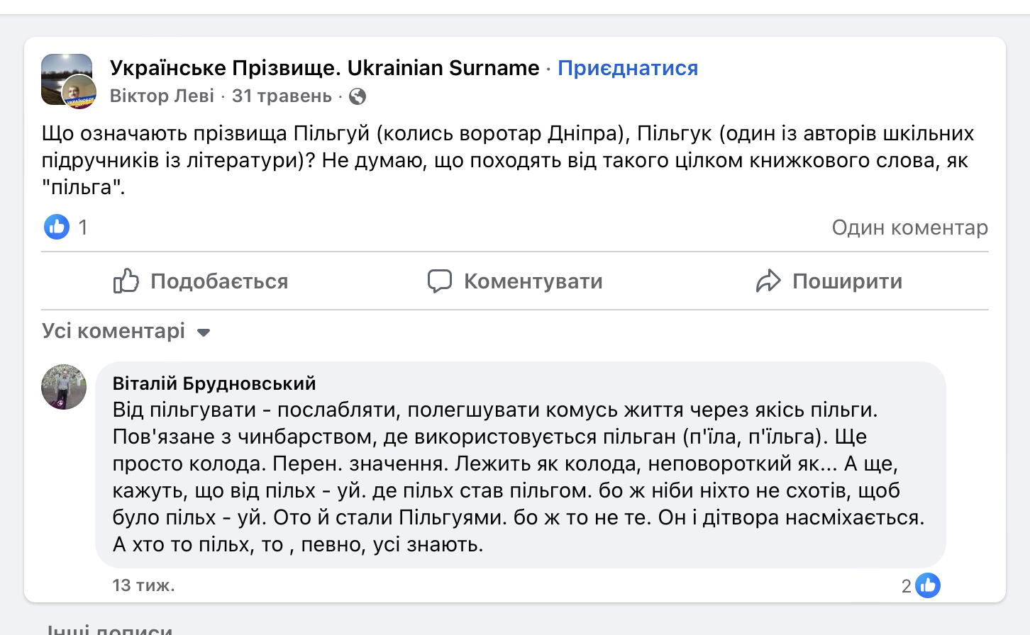 В комментариях ему ответил Виталий Брудновский, объяснивший этимологию этих необычных фамилий. По его словам, "от льготировать — ослаблять, облегчать кому жизнь через какие-то льготы". Он отметил, что это связано с кожевничеством, где используется пилган (пила, пильга) — это просто бревно или перен, лежащий как бревно, неповоротлив.
