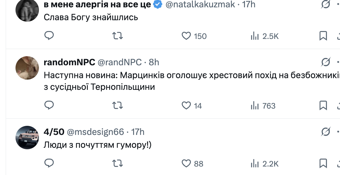 В сети пользователи создали немало мемов в соответствии с названием города и поселком. Кое-где на фото со Шматько и Собковым в шутку дорисовали рога чертей. Были и шутки о том, что теперь Чортков и Сатанов будут вместе производить котлы и казаны.