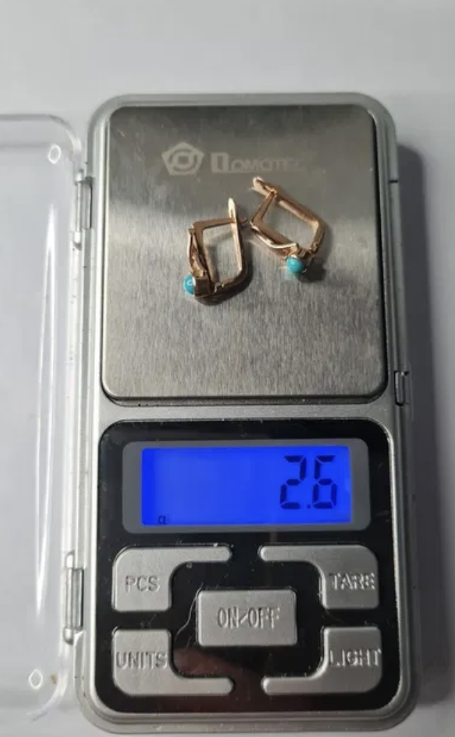 На фото видно, что это классические серьги с английской застежкой. Они имеют большой камень — бирюза, в зубчатой оправе. Вес одной серьги где-то 1,3 г вместе с камнем. Владелец уверяет, что серьги имеют пробу 583 со звездой.