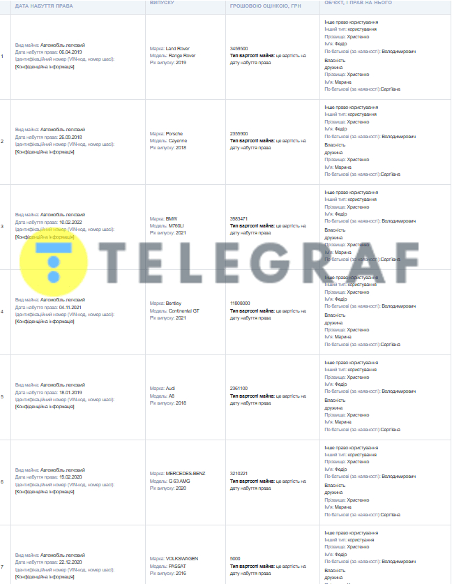- семь автомобилей брендов Range Rover, Porsche Cayenne, BMW, Bentle, Mercedes-Benz, Volkswagen Passat, Audi.