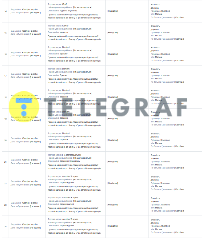 Кроме этого, супруги владеют 22 наручными часами элитных марок Rolex, Van Cleef & Arpels, Bvlgari. Среди прочего, Марина имеет 53 ювелирных изделия брендов Graff, Cartier, Van Cleef & Arpels, Giorgio Visconti, Harry Winston.