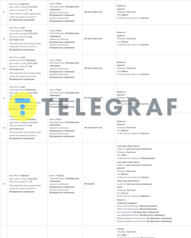 После начала полномасштабного вторжения России в Украину супруги Христенко переехали в Варшаву. Впоследствии они сменили место жительства на Объединенные Арабские Эмираты. Интересно, что в декларации нардепа за 2024 год нет информации о его доходах, а также неизвестно, как зарабатывает жена Марина. Вместо этого можно увидеть большое количество недвижимости, автомобилей и другого имущества. На Марину оформлено такое имущество: