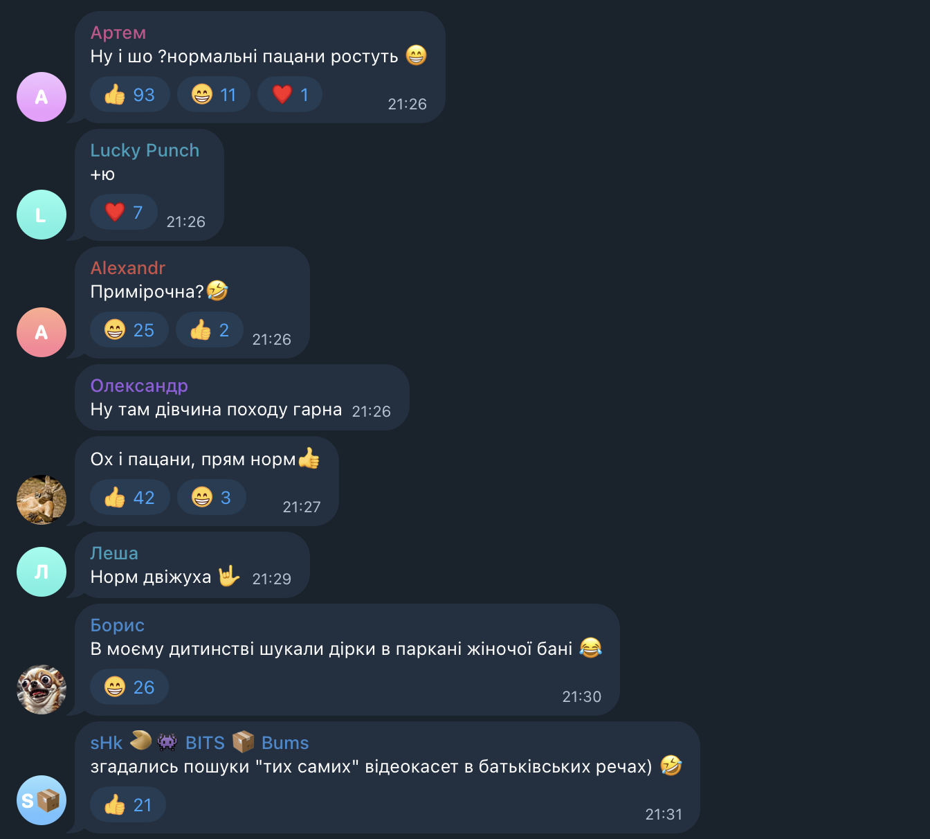 Особенно развеселил зрителей комментарий о том, что в детстве искали дыры в заборе женской бани. Также есть упоминания о поисках видеокассет в родительских вещах.