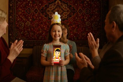 "Телеграф" с помощью нейросети попытался воспроизвести, как выглядел день рождения в 2000 годах, когда детям дарили шоколадку "Оленка" вместо дорогих подарков. На фото видна счастливая девочка в бумажной короне, которая держит в руках заветную плитку. Вокруг нее аплодируют родные — именно такие скромные, но искренние празднества были типичными для того времени.