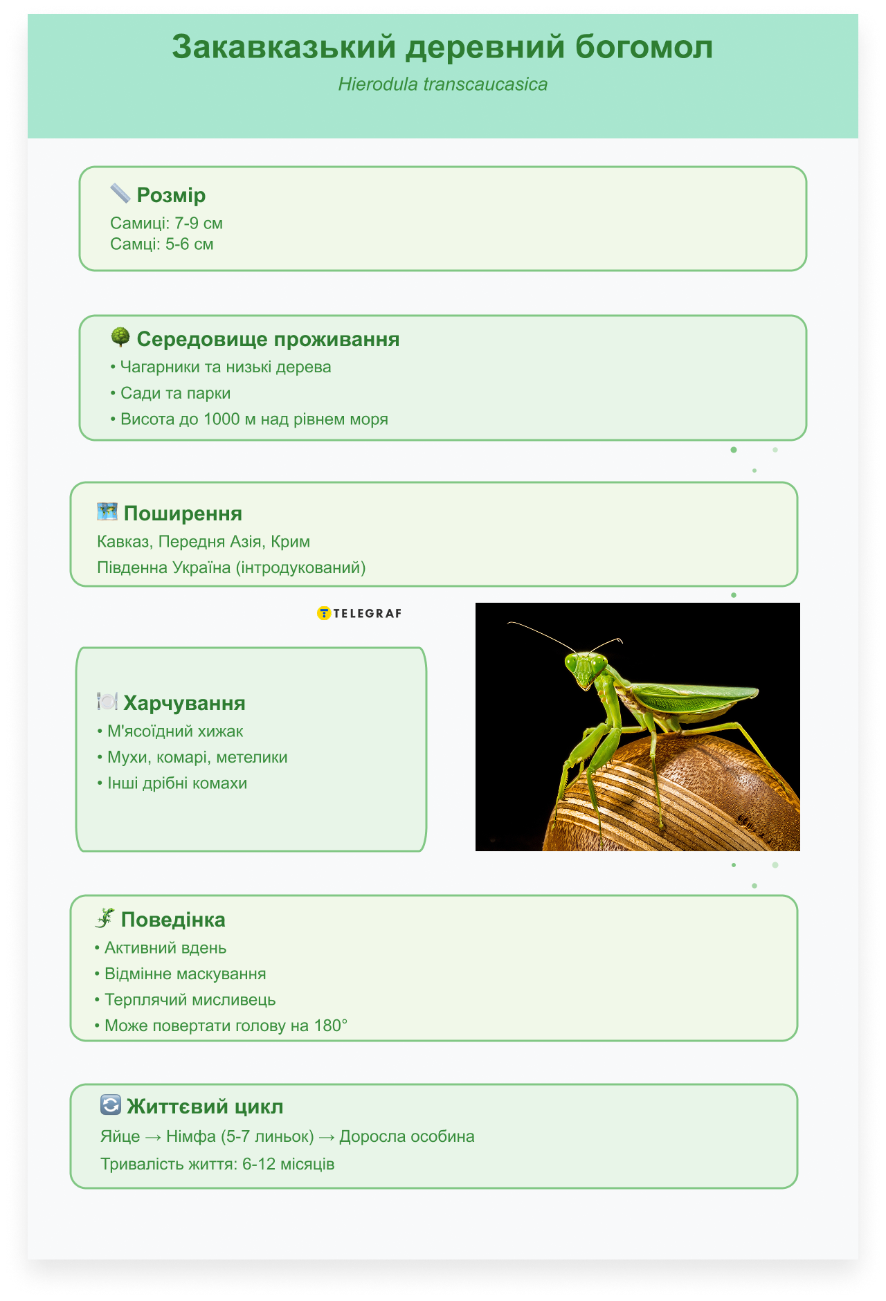 Закавказский древесный богомол (Hierodula transcaucasica) – это один из самых больших видов богомолов, обитающих на территории Украины. Самки этого вида могут достигать 7-8 сантиметров в длину, что делает их значительно больше самцов.