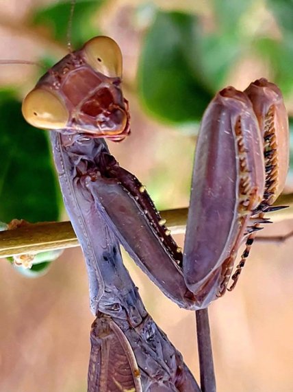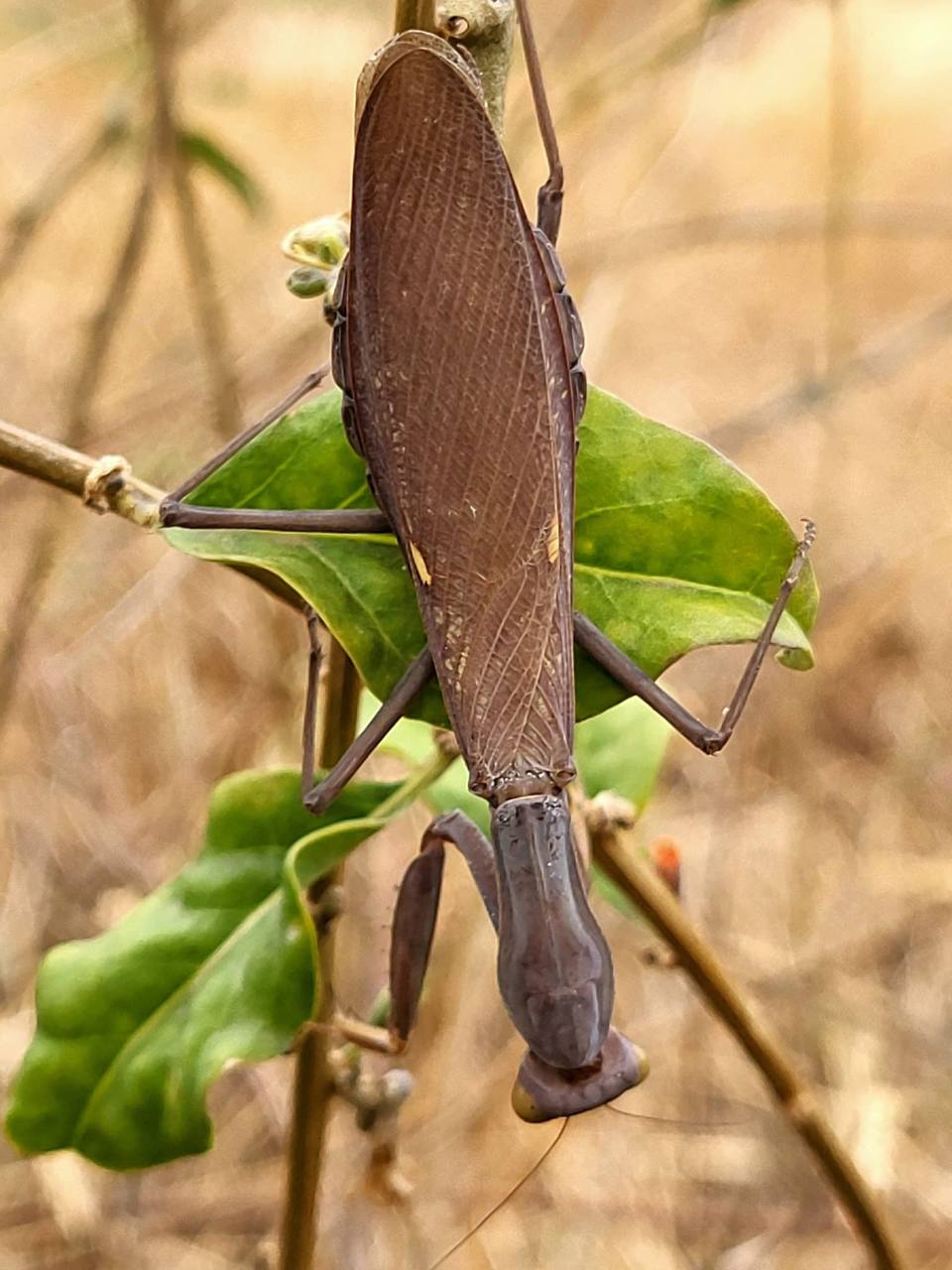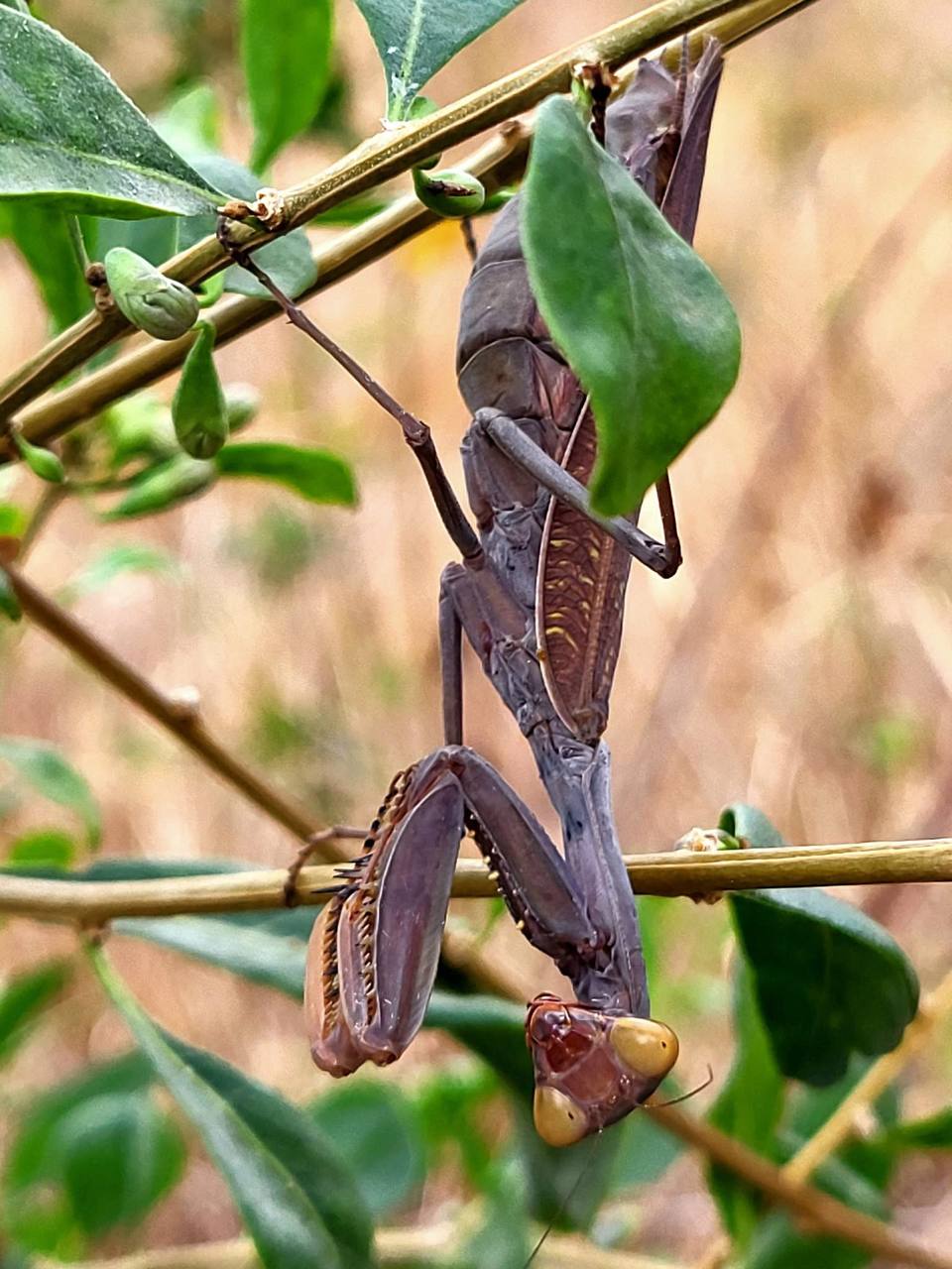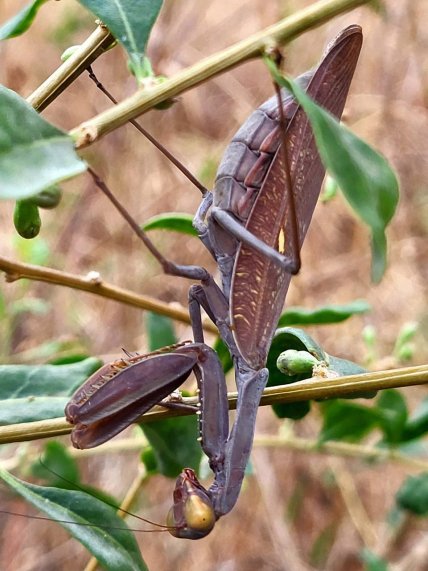 Прошло уже пару недель, как я встретила удивительную коричневую самочку закавказского древесного богомола по дороге в Аркадию, на склонах у моря. И сегодня после дождя решила пройти по тому же маршруту встретившийся с надеждой замечательную незнакомку. И вот чудо — на том же кусте я ее нашла! Сидит тихонько, замерла, видимо, охотилась или отдыхала. Самка, как мне показалось, немного потемнела, набрав цвет молочного шоколада. И брюшко такое большое, словно готовое взорваться малышами, — делится женщина.