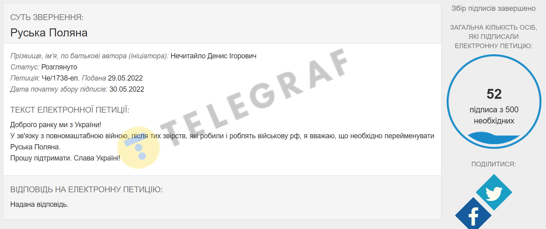 На сайте городского совета Черкасс 29 мая 2022 зарегистрировали петицию о переименовании села Русская Поляна. Ее автор Денис Нечитайло обосновал это предложение зверствами, которые россияне делали и продолжают поступать в Украине. Однако петиция набрала только 52 голоса из 500 необходимых.