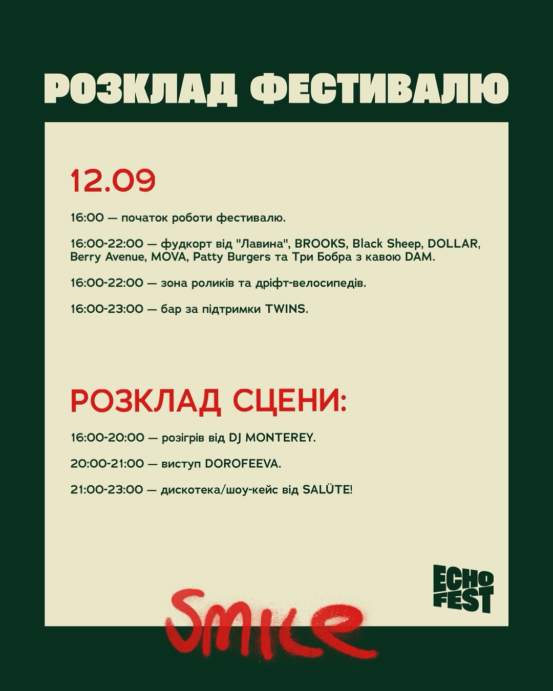 Согласно сообщению на Facebook-странице фестиваля, 12 сентября выступала певица Надя Дорофеева. Дискотека продолжалась до 23:00. Фестиваль продлится еще два дня — в субботу-воскресенье 13-14 сентября.
