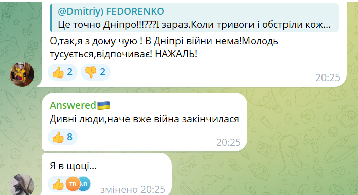 - О да, я из дома слышу! В Днепре войны нет! Молодежь тусуется, отдыхает! К сожалению