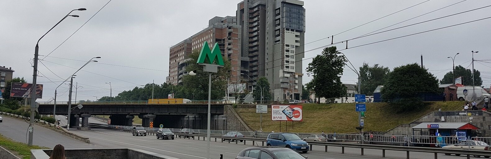 Многоэтажные здания советской эпохи, широкие проспекты и характерная архитектура того времени создают атмосферу прошлых десятилетий. Этот транспортный узел и сегодня остается уникальным — не так уж много мест в Киеве, где трамвай курсирует практически над станцией метро.