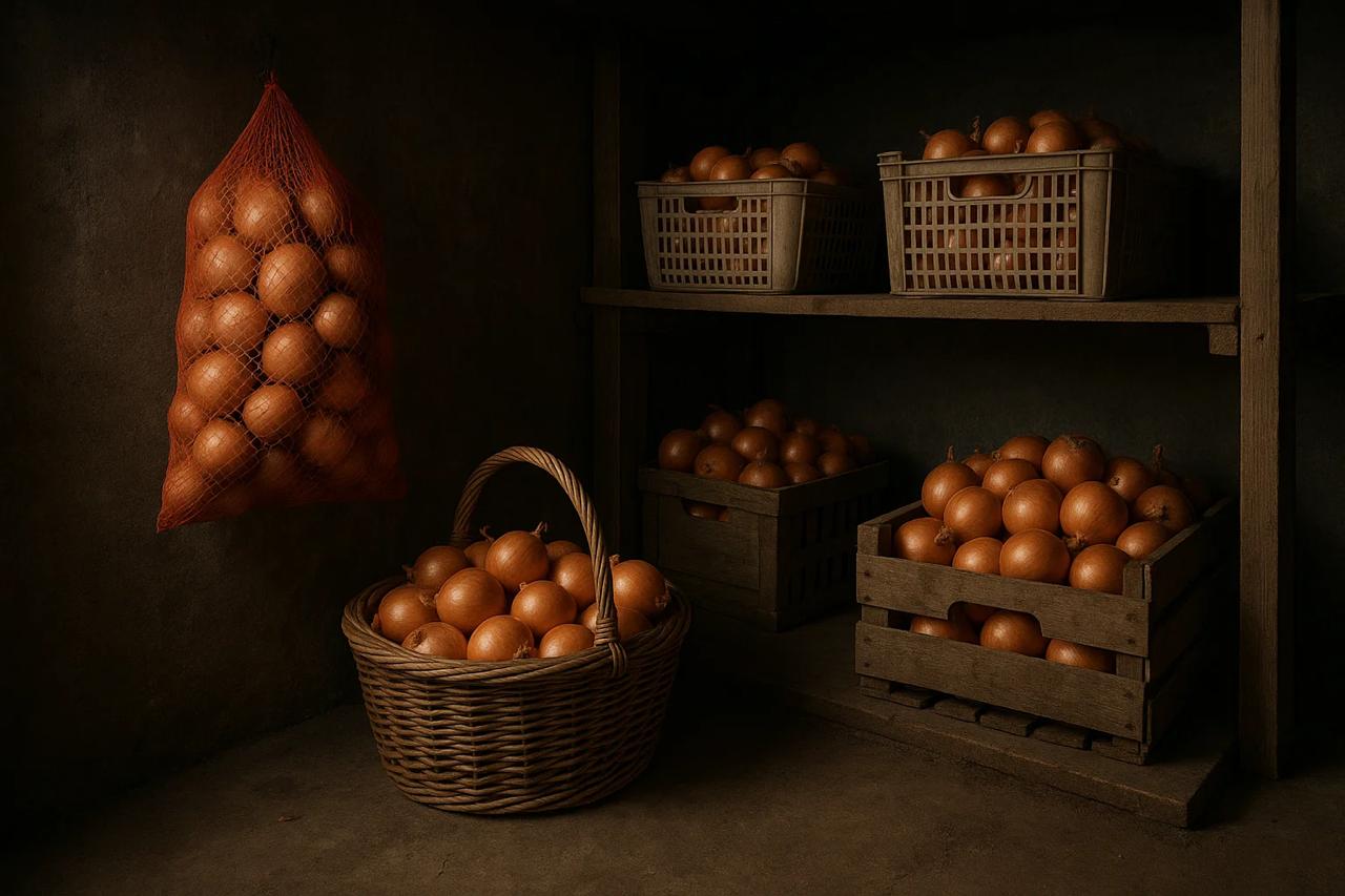 Чтобы лук оставался свежим всю зиму, его после сбора необходимо хорошо просушить в теплом и проветриваемом месте. Лучше всего держать ее в сетках, корзинах или ящиках с отверстиями, где обеспечивается свободная циркуляция воздуха.