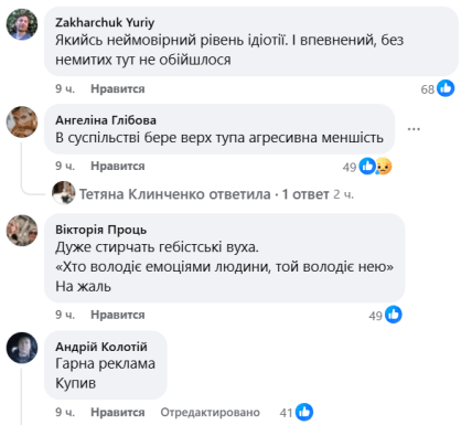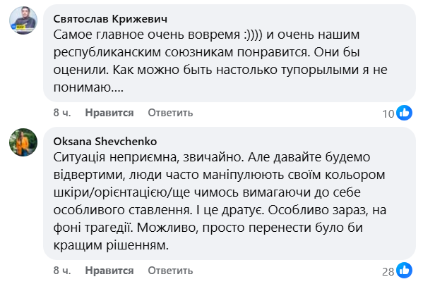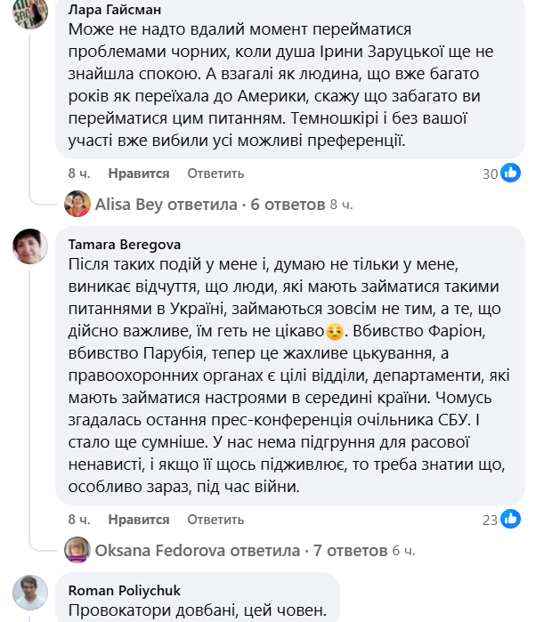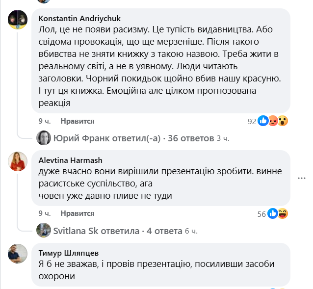 В комментариях под сообщением издательства об отмене мероприятия мнения украинского общества разделились. Многие писали, что скандал с презентацией – результат операции российских спецслужб. В то же время украинцы отмечали, что это событие после убийства Ирины Заруцкой является провокацией издательства, которое "плывет не туда". "Это – не проявления расизма. Это – тупость издательства. Или сознательная провокация – что еще более мерзко", – считает один из интернет-пользователей.